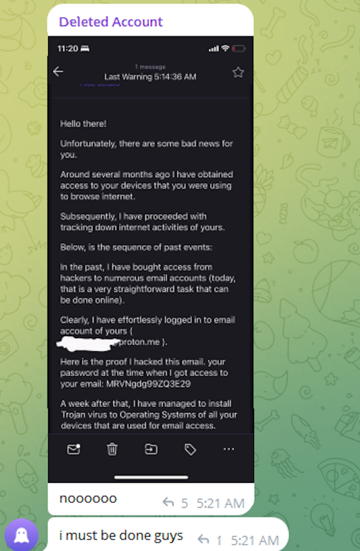 In that February 2024 post concerning the CDC data, Hikki-Chan provided a Telegram username, @wristmug, as a contact method. In May 2024, the @wristmug account posted within a Telegram group chat named "Pantifan," sharing a screenshot of an extortion email they claimed to have received. This email contained their email address and password. The message shared by @wristmug appeared to be part of an automated sextortion scam, falsely asserting that a hacker had compromised the recipient’s computer and recorded them engaging in illicit activities, threatening to release the fabricated video unless a Bitcoin ransom was paid. The scam messages typically reference a previously used, legitimate password to lend an air of credibility.